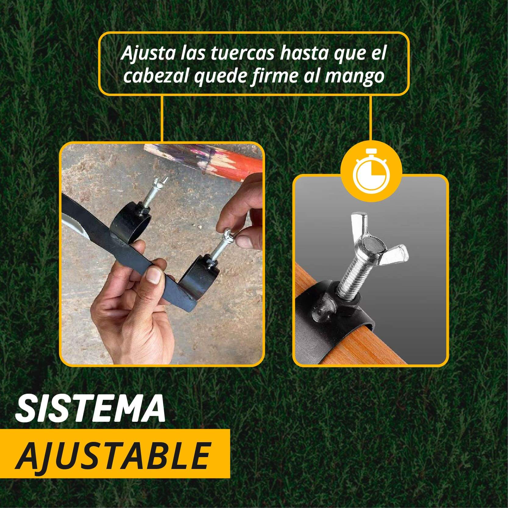 Equipado con un sistema de ajuste mediante pernos y tuercas de mariposa, permite una instalación rápida y segura en mangos de diferentes tamaños. Facilitando cambios rápidos brindando comodidad y ahorro de tiempo en el trabajo diario.